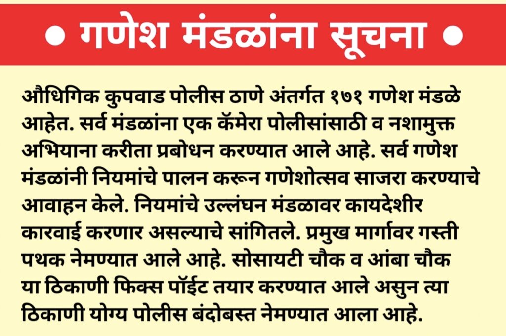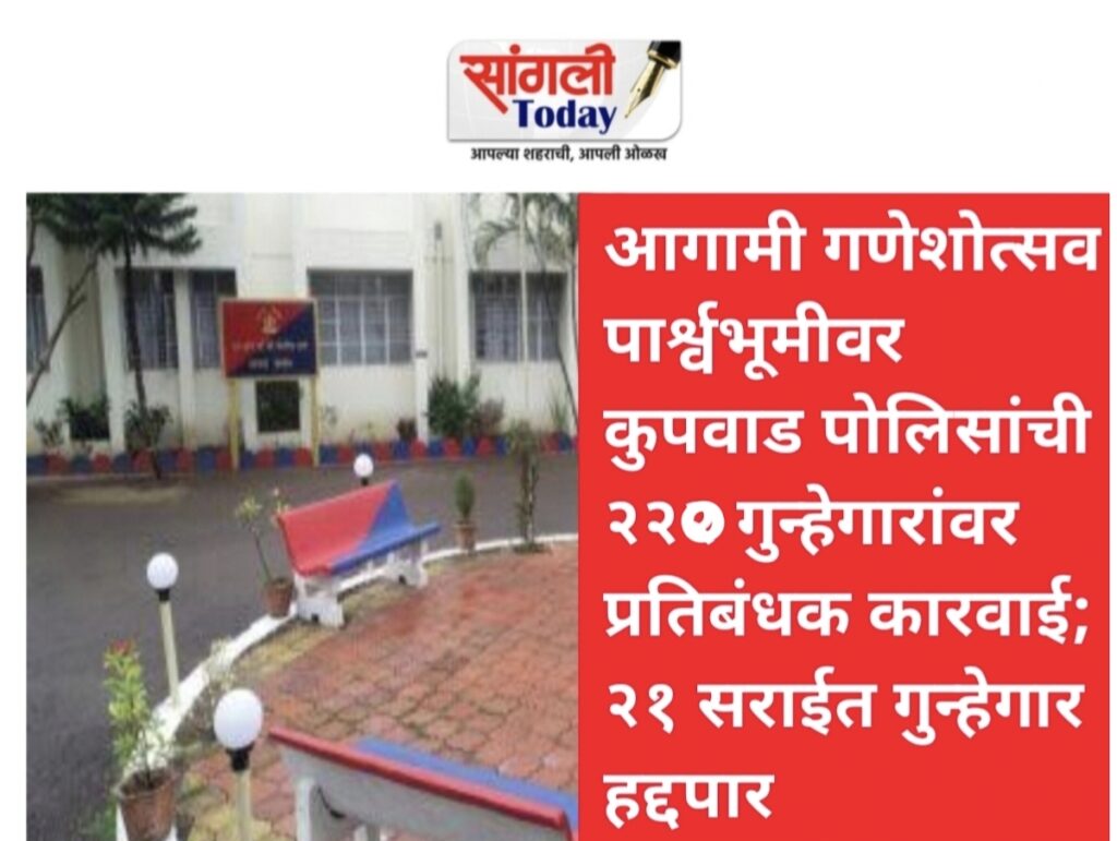 कुपवाड, ता.२५: आगामी गणेशोत्सवच्या पार्श्वभूमीवर कुपवाड पोलिसांनी कारवाईचा बडगा उगारला. पोलीस प्रमुख संदीप घुगे, अप्पर पोलीस अधीक्षक कल्पना बारवकर व मिरज उपाधीक्षक प्रणील गिल्डा यांच्या मार्गदर्शनाखाली कुपवाड पोलीस ठाण्याचे सहाय्यक पोलीस निरीक्षक दीपक भांडवलकर यांनी २२० गुन्हेगारांनवर प्रतिबंधक कारवाई तर २१ सराईत गुन्हेगारांना हद्दपारची कारवाई केली. गणेशोत्सवच्या पार्श्वभूमीवर नागरिकांच्या सुरक्षिततेसह शांतता व सुव्यवस्था अबाधित राहावी याकरीता कारवाई करण्यात आली असल्याची दीपक भांडवलकर यांनी सांगितले.