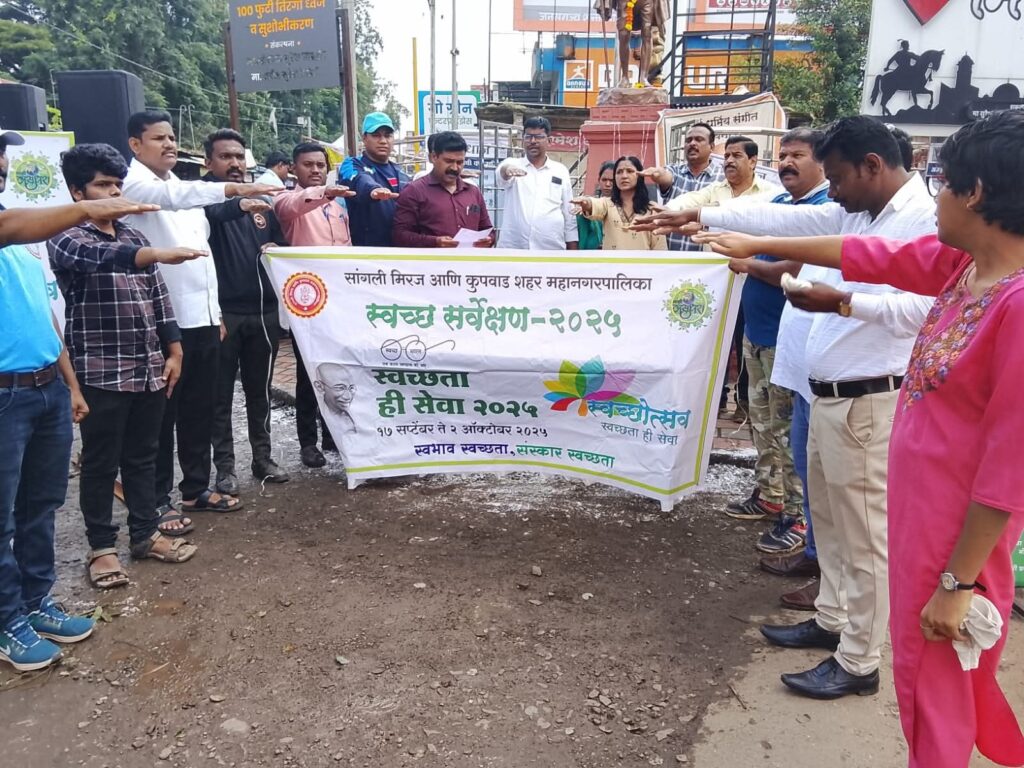 सांगली, ता.२: महात्मा गांधी जयंतीनिमित्त सांगली स्टेशन चौक येथे “स्वच्छता ही सेवा” उपक्रमाचा समारोप शपथग्रहण समारंभाने झाला. सलग पंधरा दिवस राबविण्यात आलेल्या या मोहिमेत अधिकारी, कर्मचारी व नागरिकांचा उत्स्फूर्त सहभाग होता. सांगली-मिरज-कुपवाड महानगरपालिकेच्या वतीने “स्वच्छता ही सेवा” उपक्रमांतर्गत विशेष स्वच्छता पंधरवडा राबविण्यात आला. १६ सप्टेंबरपासून सुरू झालेल्या या उपक्रमाचा समारोप आज, २ ऑक्टोबर महात्मा गांधी जयंती निमित्त सांगली स्टेशन चौक येथे आयोजित करण्यात आला. या प्रसंगी उपस्थितांनी एकत्रितपणे “स्वच्छता ही सेवा” शपथ घेतली. उपक्रमादरम्यान नागरिकांमध्ये स्वच्छतेबाबत जनजागृती करण्यात आली तसेच विविध कार्यक्रम – सायकल रॅली, विद्यार्थी रॅली, स्वच्छता मोहिमा राबविण्यात आल्या.
