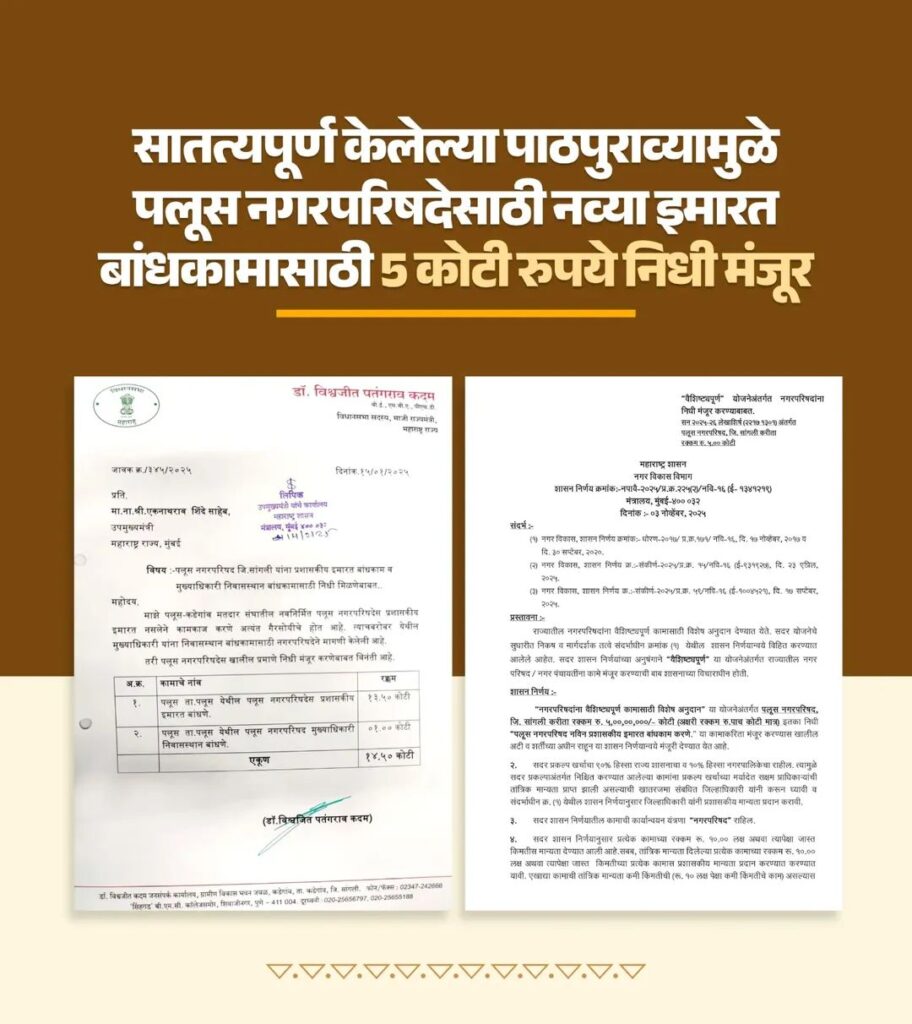 गेल्या काही दिवसांपासून या नव्या प्रशासकीय इमारतीसाठी निधी मंजूर व्हावा, यासाठी सातत्याने पाठपुरावा सुरू होता. अखेर या प्रयत्नांना यश आले आहे. या निधीमुळे पलूस नगरपरिषदेला एक आधुनिक आणि नागरिकाभिमुख कार्यालयीन वास्तू उभी करता येणार आहे.विशेष म्हणजे, काही दिवसांपूर्वी पलूस शहरासाठी स्वतंत्र नळपाणीपुरवठा योजनेच्या पाणीपूजन कार्यक्रमावेळी, स्थानिक स्वराज्य संस्थांच्या निवडणुकीची आचारसंहिता लागण्यापूर्वी हा निधी उपलब्ध करून दिला जाईल, असा शब्द पलूसवासीयांना देण्यात आला होता. आज या शब्दाची पूर्तता झाल्याने आनंद व्यक्त होत आहे. –