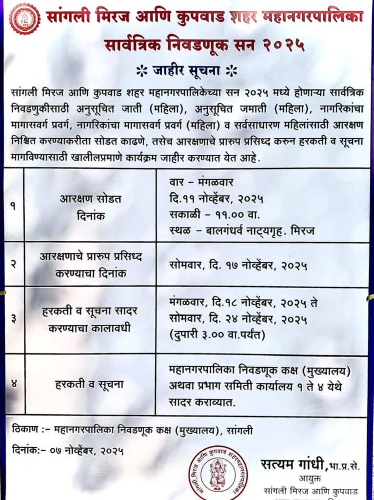 आरक्षण प्रसिद्धी १७ नोव्हेंबर २०२५ (सोमवार) हरकती व सूचनांचा कालावधी १८ नोव्हेंबर २०२५ (मंगळवार) ते २४ नोव्हेंबर २०२५ (सोमवार) वेळ दुपारी ३.०० वाजेपर्यंत हरकती सादर करण्याचे ठिकाण नागरिकांना आपल्या हरकती व सूचना महानगरपालिका निवडणूक कक्ष (मुख्यालय), सांगली तसेच प्रभाग समिती कार्यालय क्रमांक १ ते ४ येथे प्रत्यक्ष सादर करता येणार आहेत. लोकशाही प्रक्रियेत सक्रिय सहभागाचे आवाहन महानगरपालिका आयुक्त तथा निवडणूक निर्णय अधिकारी सत्यम गांधी (भा.प्र.से.) यांनी नागरिकांना आवाहन केले आहे की, “ही सोडत पूर्णतः पारदर्शकपणे आणि लोकसहभाग सुनिश्चित करून पार पाडण्यासाठी सर्व आवश्यक उपाययोजना करण्यात आल्या आहेत. नागरिकांनी या प्रक्रियेत सक्रिय सहभाग नोंदवून लोकशाही प्रक्रियेला बळकटी द्यावी.”