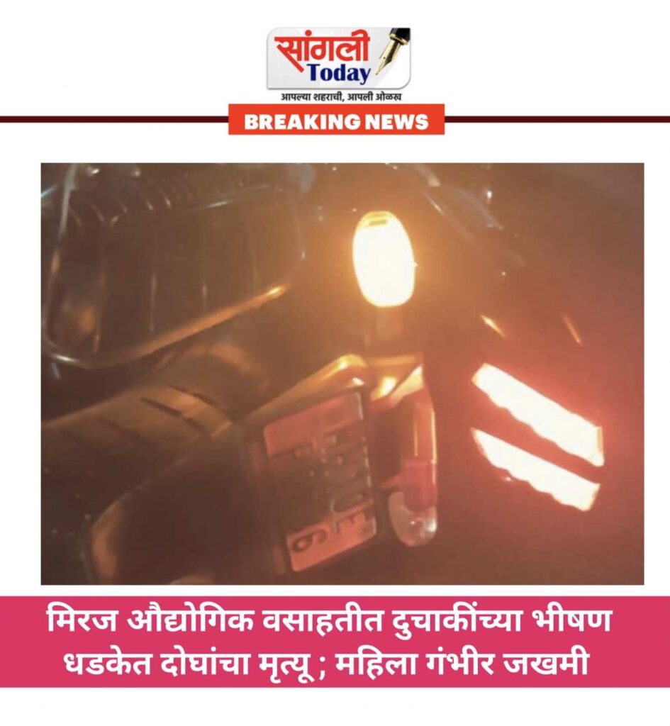 कुपवाड, २४ नोव्हेंबर : मिरज औधोगिक वसाहतीत दोन दुचाकींचा समोरा-समोर झालेल्या धडकेत दोघेजण ठार तर एक महिला गंभीर जखमी झाल्याची घटना सोमवारी (ता.२४) रोजी रात्रीच्या सुमारास घडली. या आपघातात राहुल सुभाष कांबळे ( वय ३८ वर्ष, रा.उपळावी ता. तासगाव) तुषार अशोक पिसे ( वय २४ वर्ष रा. मुजावर प्लॅट, कुपवाड ) या दोघांचा मृत्यू झाला आहे. रेणू राजू शिंगे (वय ६५ वर्ष , सध्या रा. मुजावर प्लॅट, कुपवाड) या गंभीर जखमी झाल्या आहेत. त्यांच्यावर शासकीय रुग्णलयात उपचार सुरु आहे.
